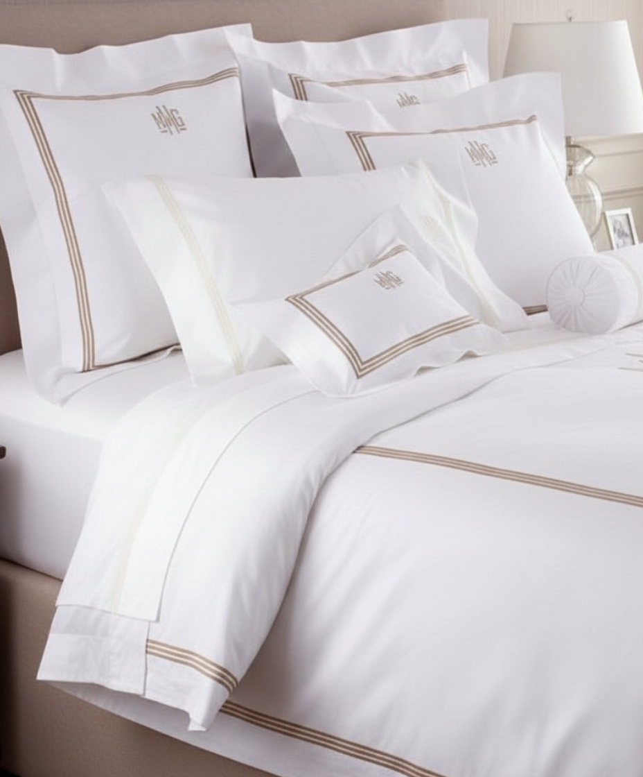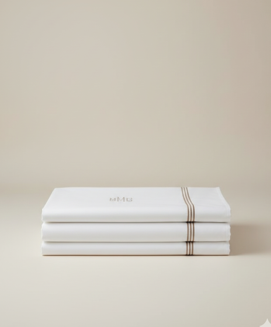 Este juego de cama destaca por su elegancia clásica. El monograma bordado a mano se convierte en el corazón del diseño, acompañado de líneas finas que enmarcan la composición con equilibrio y sobriedad. La tela blanca aporta luz y serenidad, creando un ambiente que recuerda la suavidad de un hotel boutique. Podemos personalizar iniciales, colores, puntadas y dimensiones para crear un juego verdaderamente especial y único.
