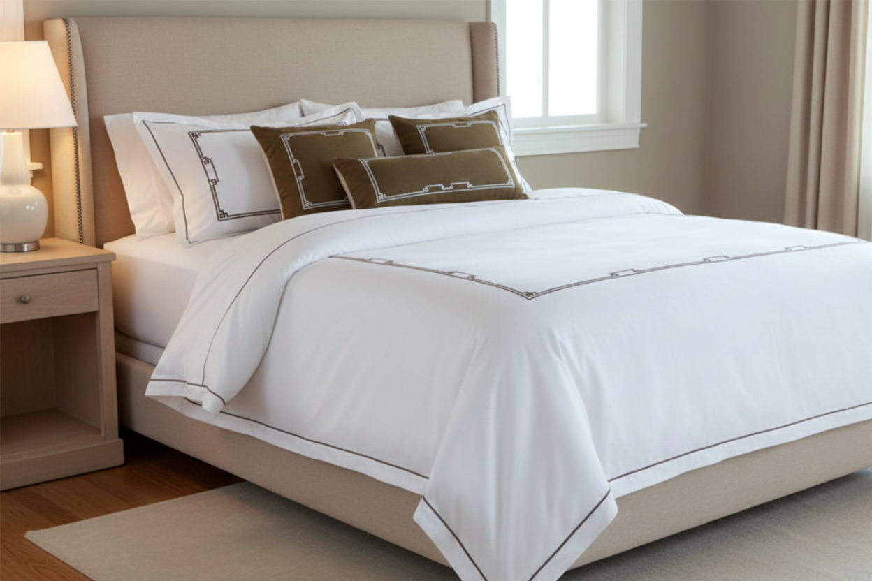Este juego de cama está pensado para quienes disfrutan la pureza del blanco con un detalle sutil que enmarca la elegancia. Las líneas en tono café delinean la forma con precisión artesanal, creando un estilo limpio y sereno que transforma la habitación al instante. La tela es suave y fresca, perfecta para descansar envueltos en comodidad. Podemos personalizar el color del marco, el tipo de puntada y las medidas exactas para que se ajuste perfectamente a tu cama y a tu estilo.