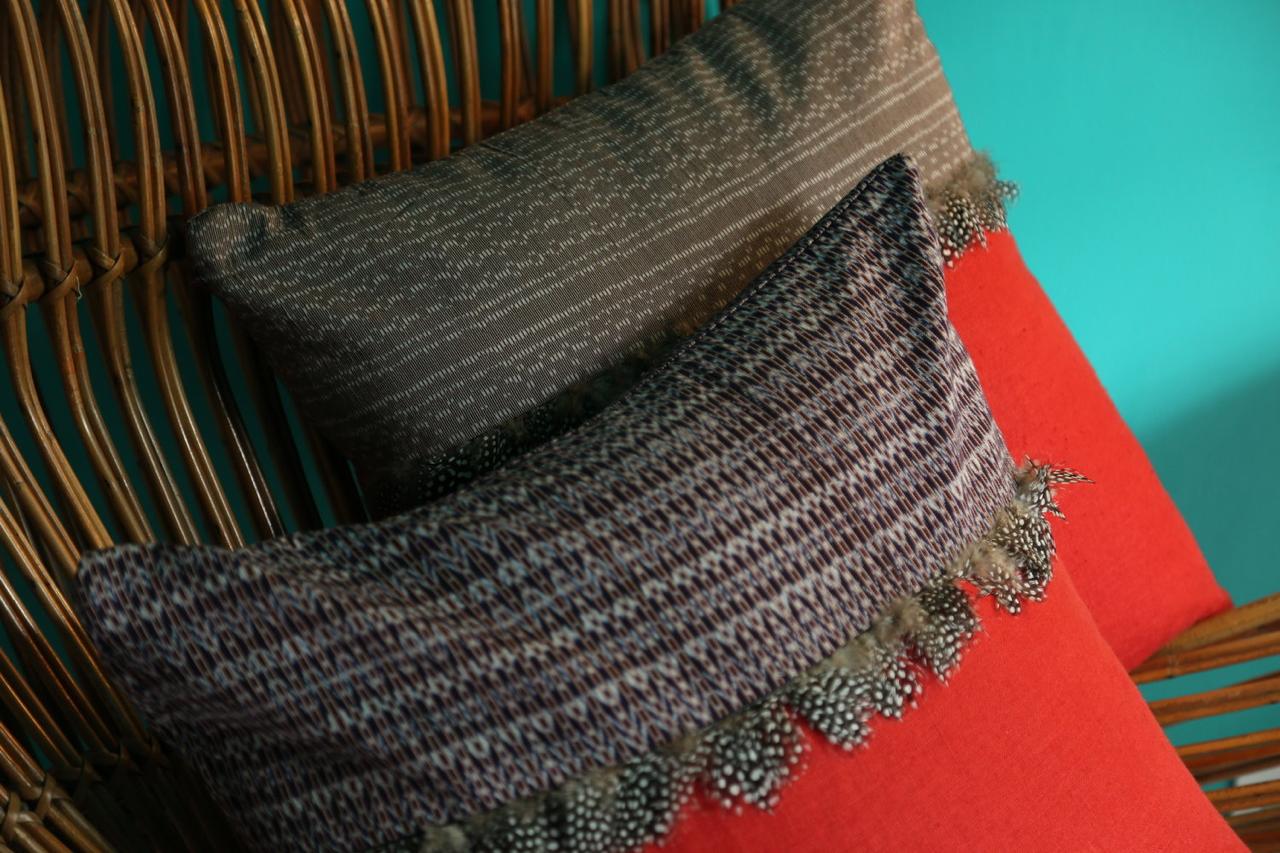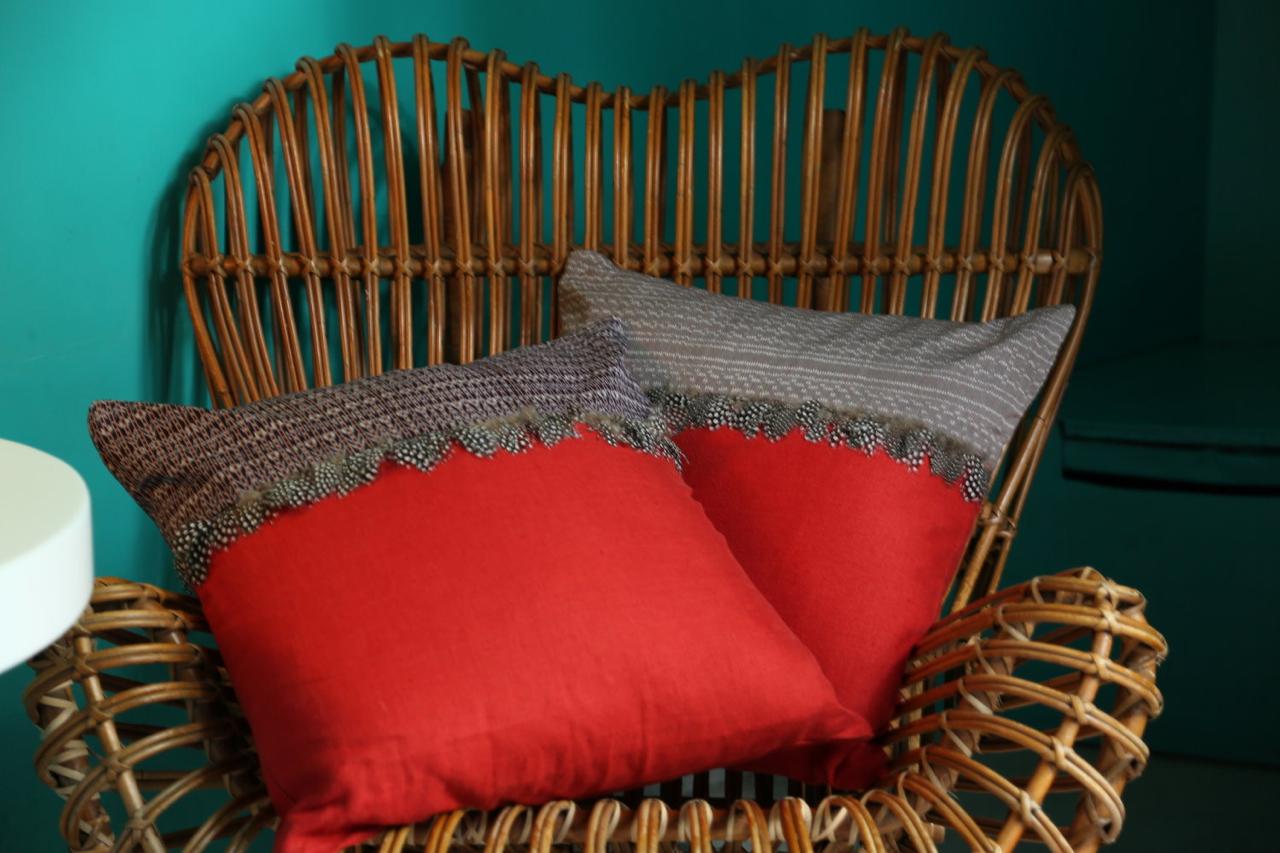 Este diseño juega con la intensidad del rojo y la textura sobria del tejido gris, creando un contraste audaz y lleno de carácter. La franja de plumas naturales aporta un toque exótico y artesanal que dota a la pieza de movimiento y personalidad única. Ideal para salas modernas, rincones de lectura o espacios donde se busca una estética bohemia y sofisticada.