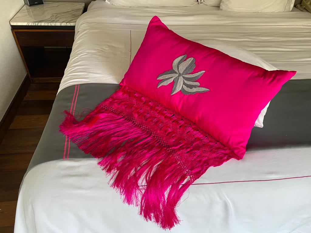 Este cojín es una pieza protagonista. El fucsia intenso aporta energía y alegría, mientras que los flecos elaborados a mano añaden carácter y movimiento. Es perfecto para dar un toque vibrante a una habitación o sala que busca un acento especial. El diseño floral bordado complementa el conjunto con un gesto delicado. En Dayan podemos adaptar el tono, el diseño y la textura para crear un cojín hecho exactamente para tu espacio.