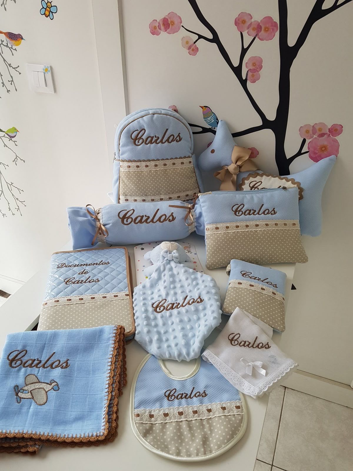 Este set está creado para celebrar la llegada de un nuevo integrante con ternura y dedicación. Cada pieza —manta, almohadita, babero, porta documentos y accesorios— lleva el nombre bordado a mano, acompañado de detalles suaves que transmiten cariño. Los tonos neutros y celestes crean una atmósfera tranquila y luminosa para la habitación del bebé. En Dayan podemos personalizar el nombre, el color, los motivos y cada elemento del kit para crear un regalo verdaderamente especial.