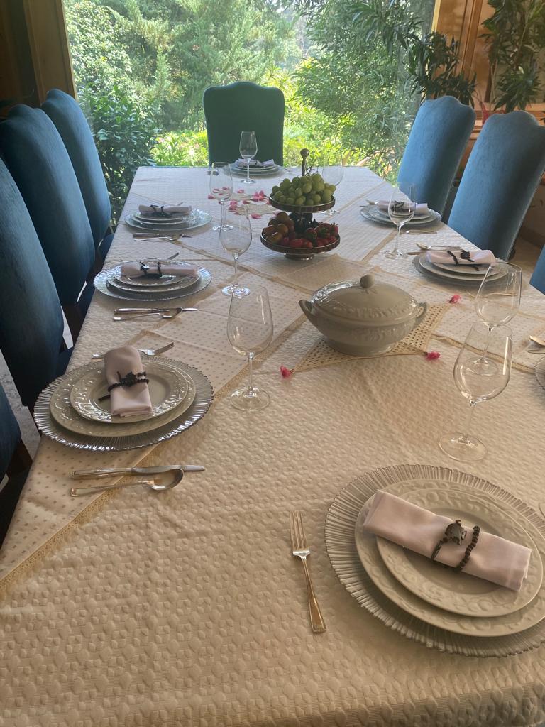Lo acompañan caminos de mesa en lino, una combinación que realza la profundidad del mantel y crea un juego visual refinado y armonioso. Este tipo de piezas pueden hacerse totalmente a la medida: elegimos juntos las telas, los tonos y el estilo que mejor combine con tu hogar.