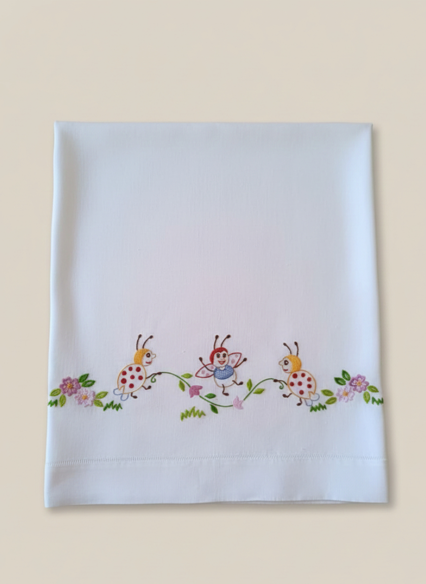 Este juego infantil está lleno de alegría. Las mariquitas bordadas a mano aportan un toque juguetón y encantador, creando una atmósfera vibrante en la habitación del bebé. Los colores vivos contrastan suavemente con la base clara, logrando un diseño equilibrado y divertido. Es perfecto para dar personalidad al espacio sin perder la delicadeza y suavidad que buscan las mamás. Todo se personaliza: nombre, tonos, motivos y medidas.